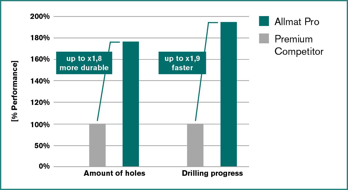 Thanks to the diamond-ground carbide tip and robust design, the drill bit lasts up to x1.8 longer - for fewer tool changes and lower costs